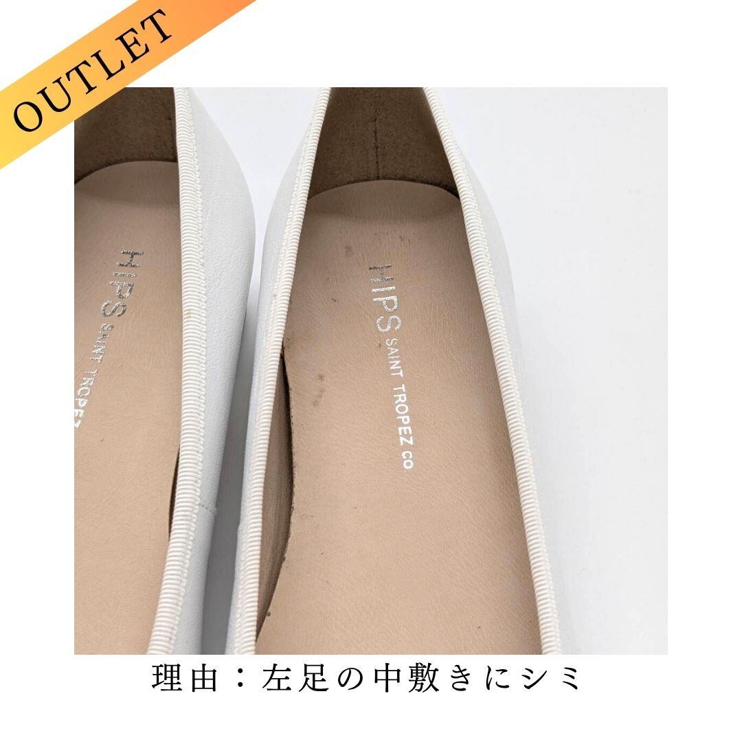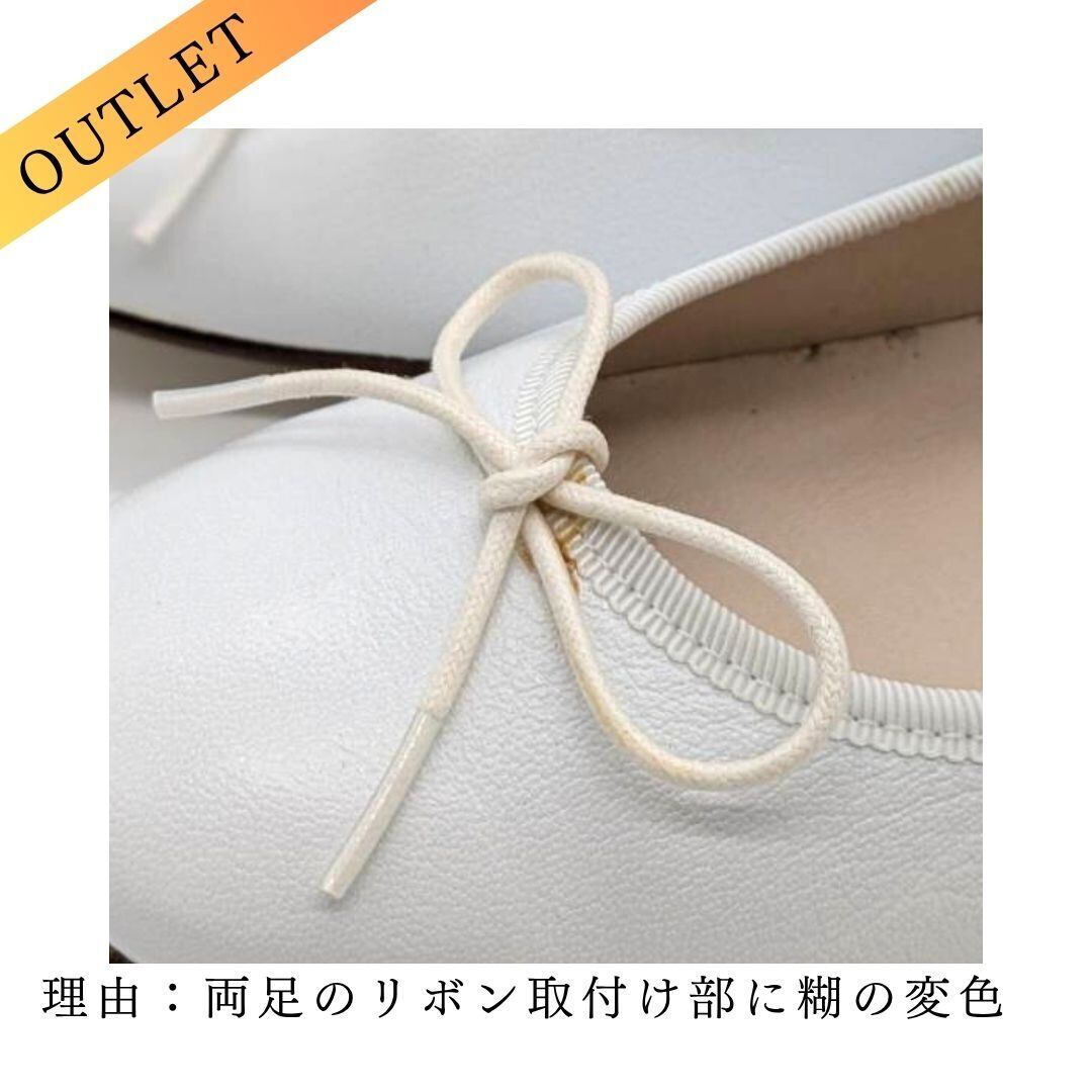 Outlet理由:接着剤の影響による色移り・汚れが一部にございます(画像をご参照ください)。 ①両足のリボン取付け部分に、接着剤による色の変化が見られます。②両足のソール部分に接着剤跡がございます。③左足の中敷き部分に、うっすらとしたシミが見られます。