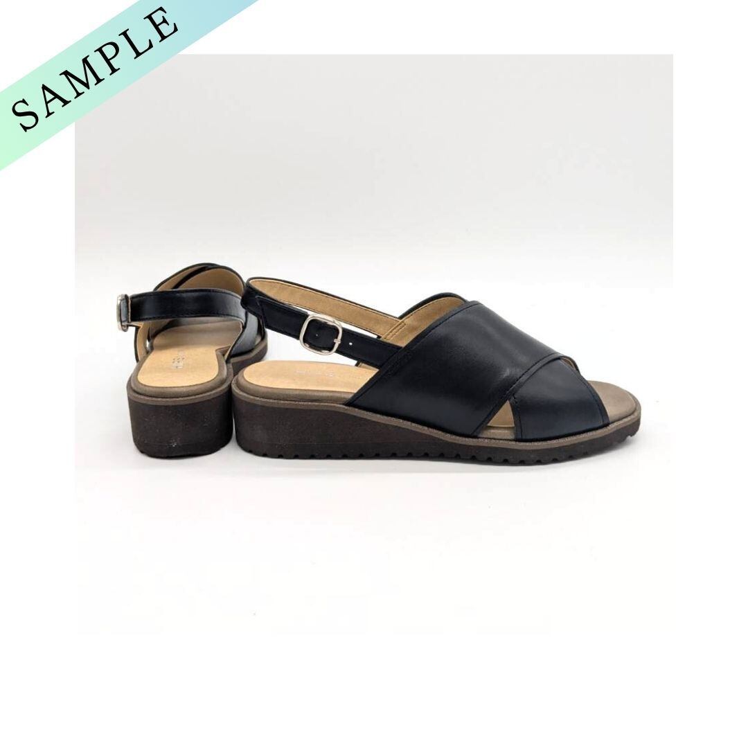 クロスしたアッパーのデザイン+バックバンドで足入れがスムーズなのに脱げにくく安心です。軽量かつちょうど良い高さのウエッジソールで快適な履き心地の1足です。