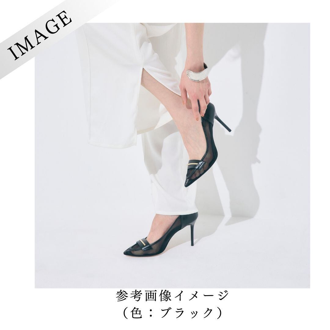大人の女性の足元にマッチする、エレガントムード漂うパンプス。トレンドのシアーなチュール、きめ細やかな肌目とツヤ感のあるスムースレザーとのコンビネーションが◎。スタイリッシュなアクセントを添えるゴールドモチーフが程よく華やかさがあり、洗練されたムードを演出してくれます。