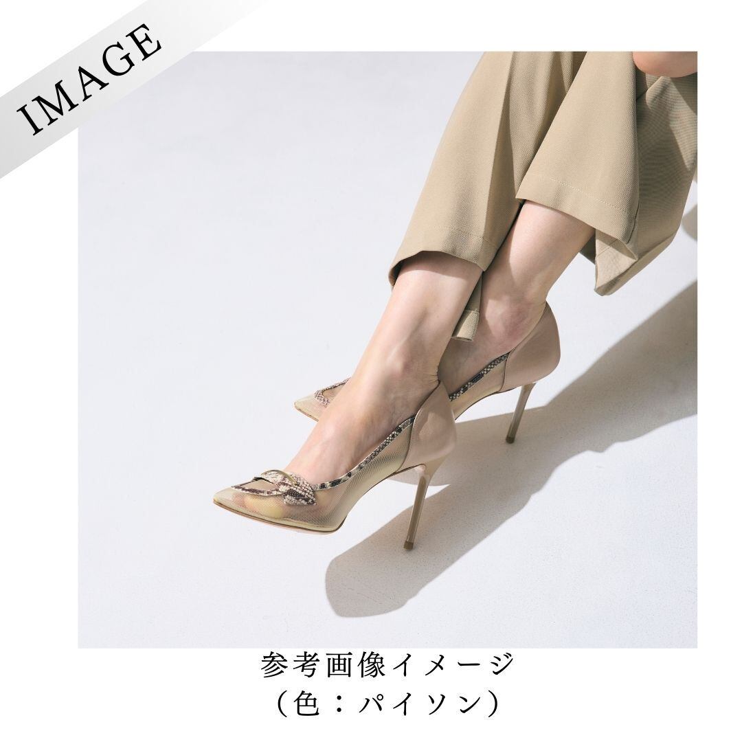 大人の女性の足元にマッチする、エレガントムード漂うパンプス。トレンドのシアーなチュール、きめ細やかな肌目とツヤ感のあるスムースレザーとのコンビネーションが◎。スタイリッシュなアクセントを添えるゴールドモチーフが程よく華やかさがあり、洗練されたムードを演出してくれます。